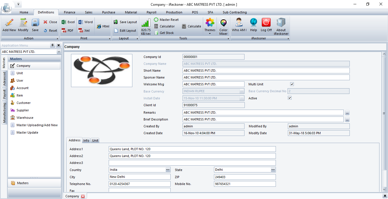 Company definition allows you to define and manage the details of your company. Company is an entity that engages in business. User cannot modify Company Name, Client ID, Currency, Base Currency Decimal once it is defined in the system as part of the initial application setup.