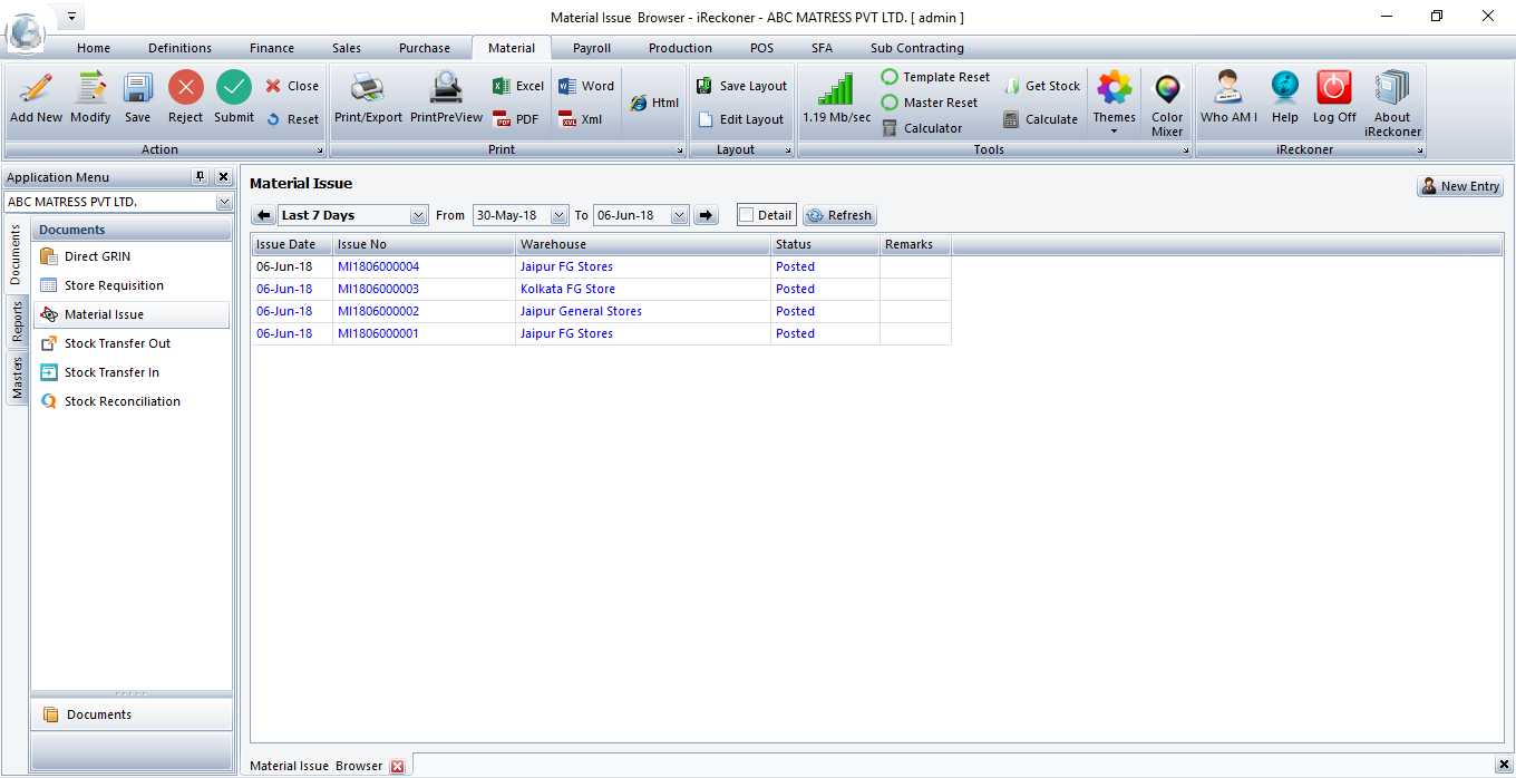 Material Issue is generated when items are issued to a particular cost center for consumption. Cost centers are treated as different departments in a company. It is generated against Store Requisition.