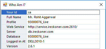 Who Am I gives you information like your login Id, name, db name, web service, Logged in System information and the iReckoner version that you're using