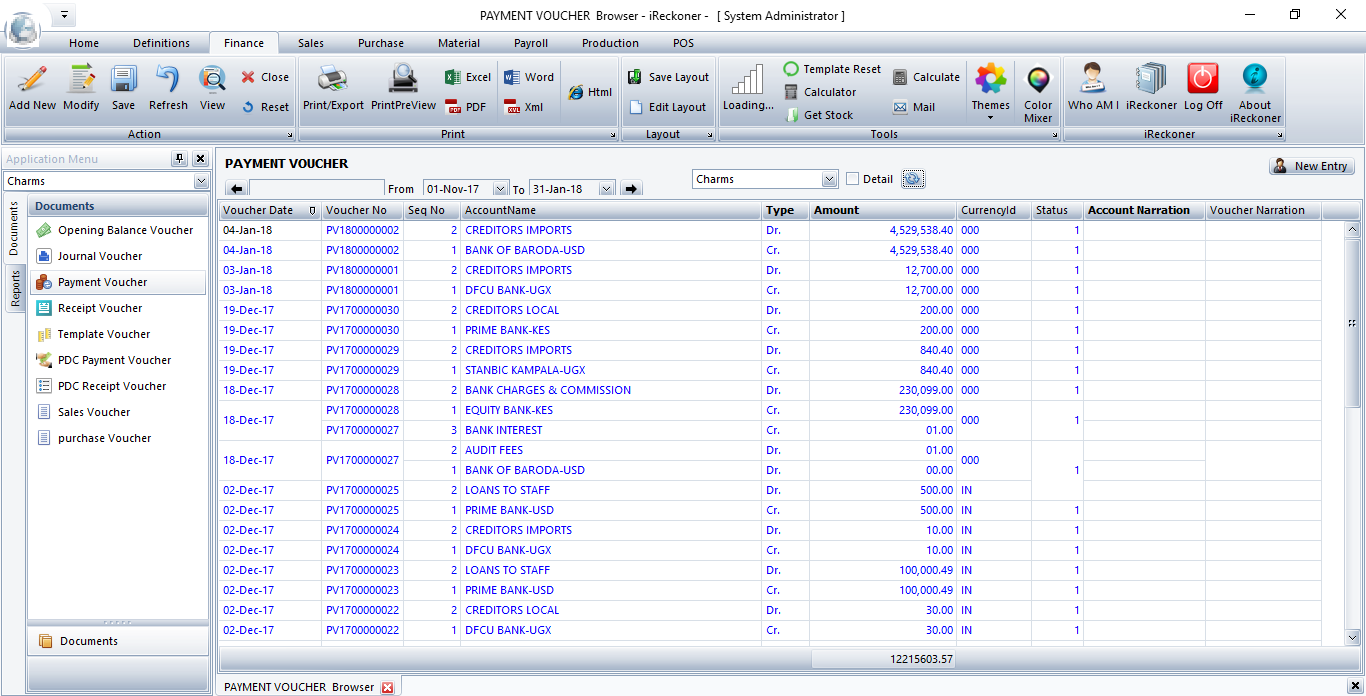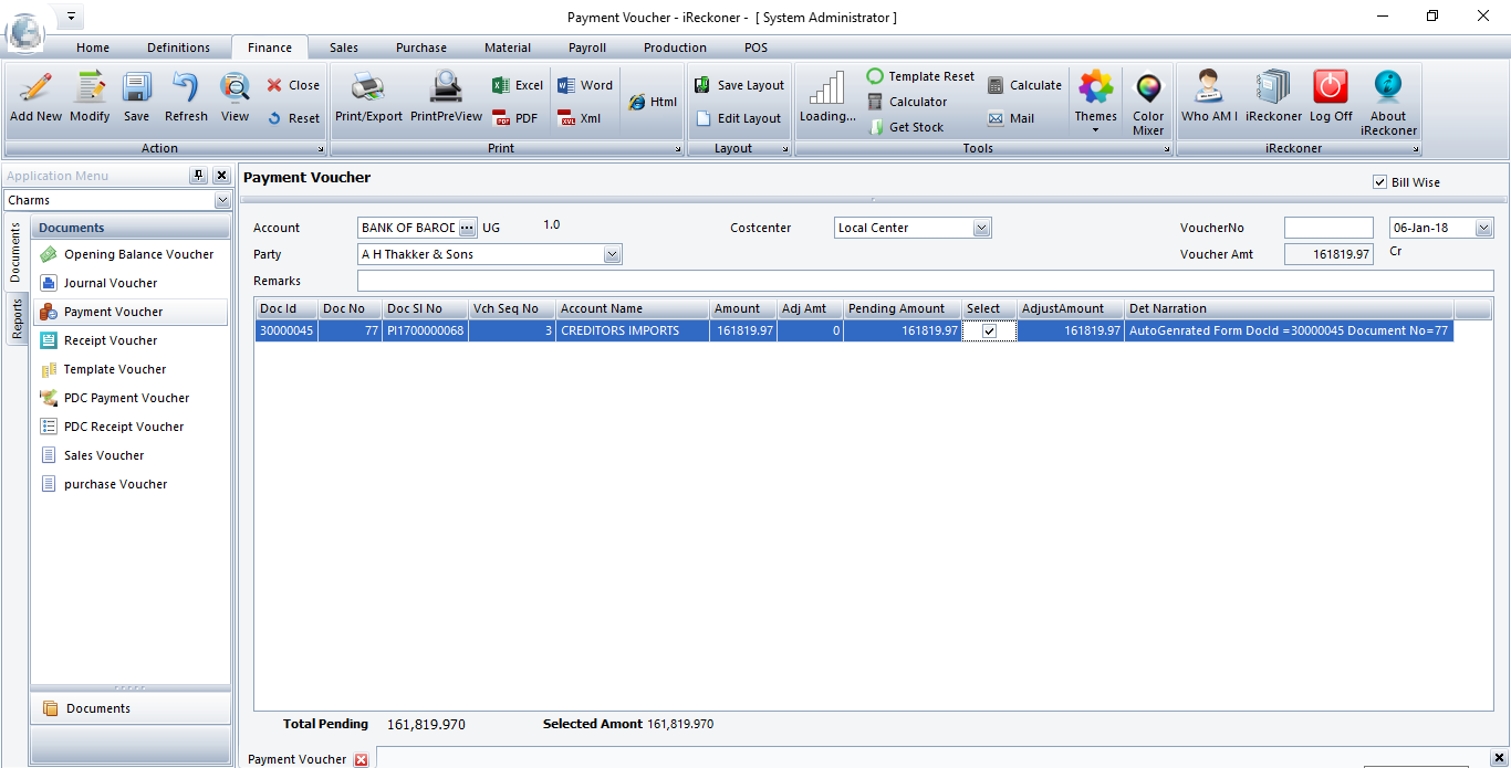 A Payment Voucher is a voucher that is used to make payments to external entities(It is used when a payment is being made to or received from a party). In payment voucher, header part is always a bank or cash account and the other account will be the account of party .Payment voucher can be generated against a purchase invoice or can be generated directly.