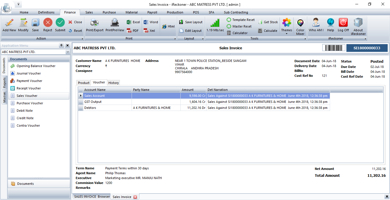 Sales voucher is generated from sales invoice. In sales voucher the header will always be party account. When a sales invoice entry is made, it will automatically generate sales voucher and can be viewed in the voucher tab. While making the sale voucher the customer’s account is debited with the full amount of invoice and the sales account is credited.